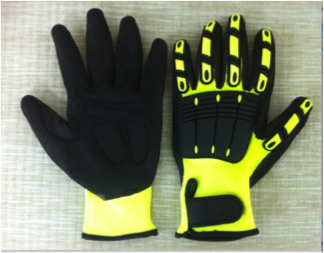 TPR impact resistant glove: 13g poly HV yellow liner, sandy nitrile palm coating,double dip. TPR stitched on back for impact resistance |