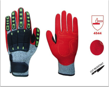 TPR impact resistant glove: EN cut5 liner in salt&pepper color,black color sandy nitrile palm coating,double dip. TPR stitched on back for impact resistance |